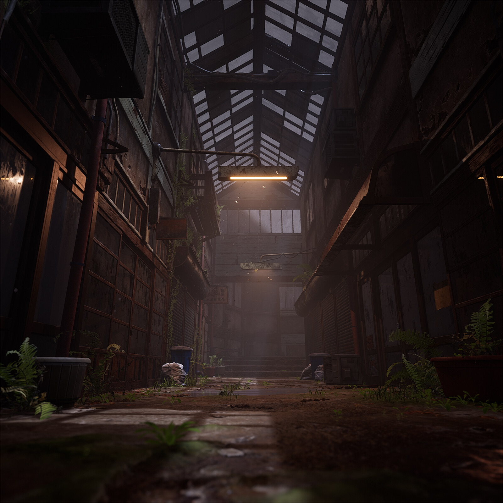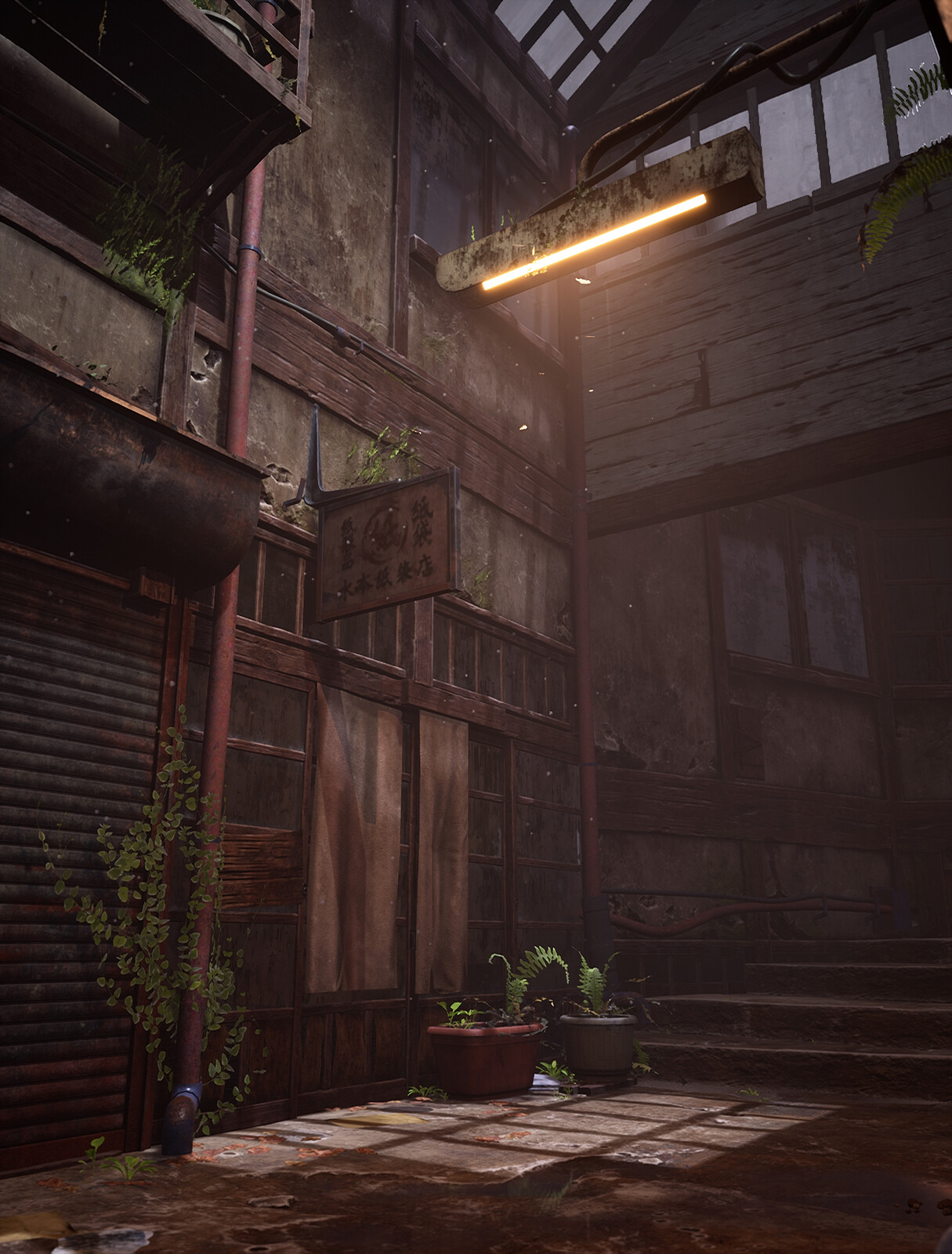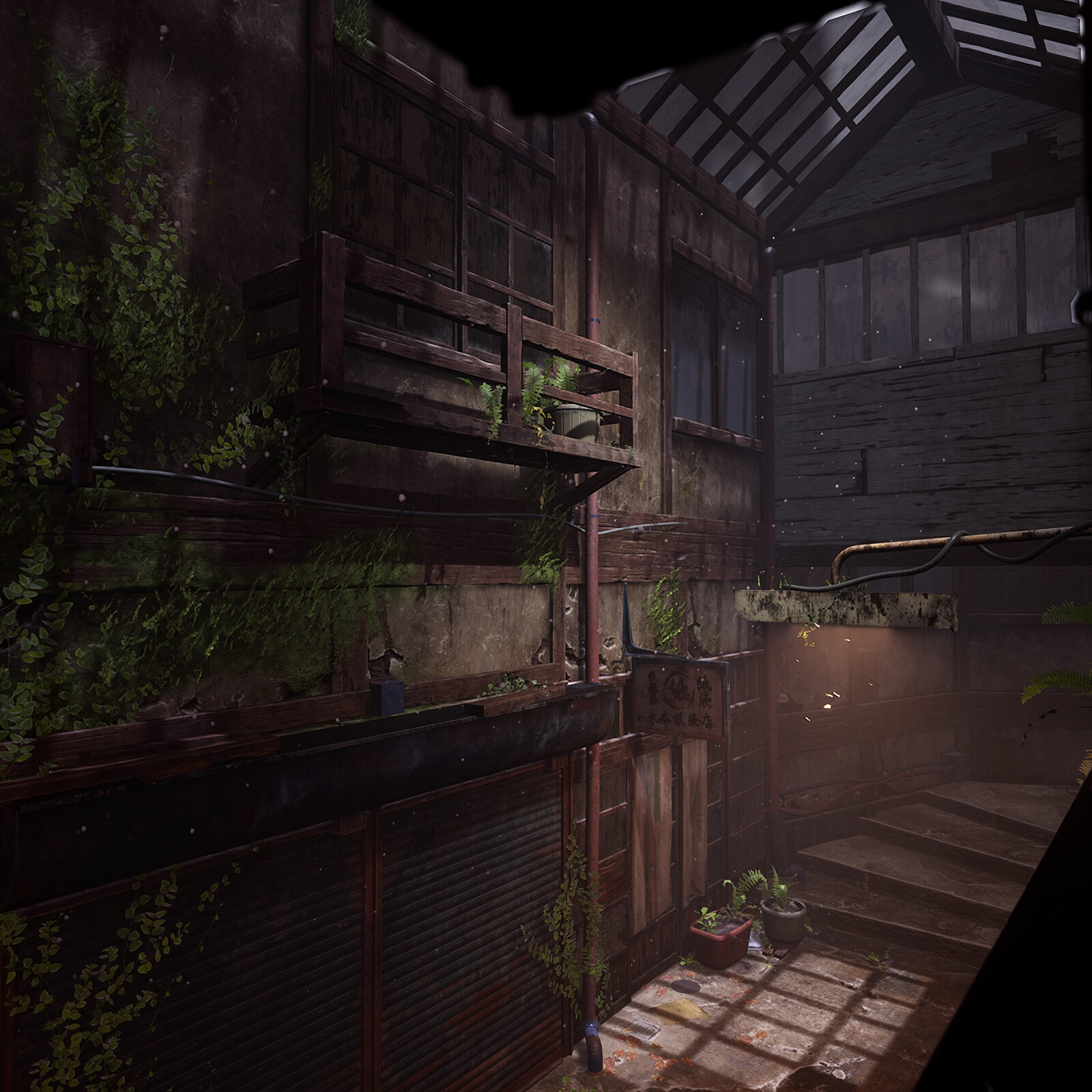 A personal project. I wanted to make a modular covered alleyway based on some images of a Japanese alleyway I found online. All the models, texture work, materials, FX, and set dressing were done by me. The plants and some of the small debris are Quixel Megascans.