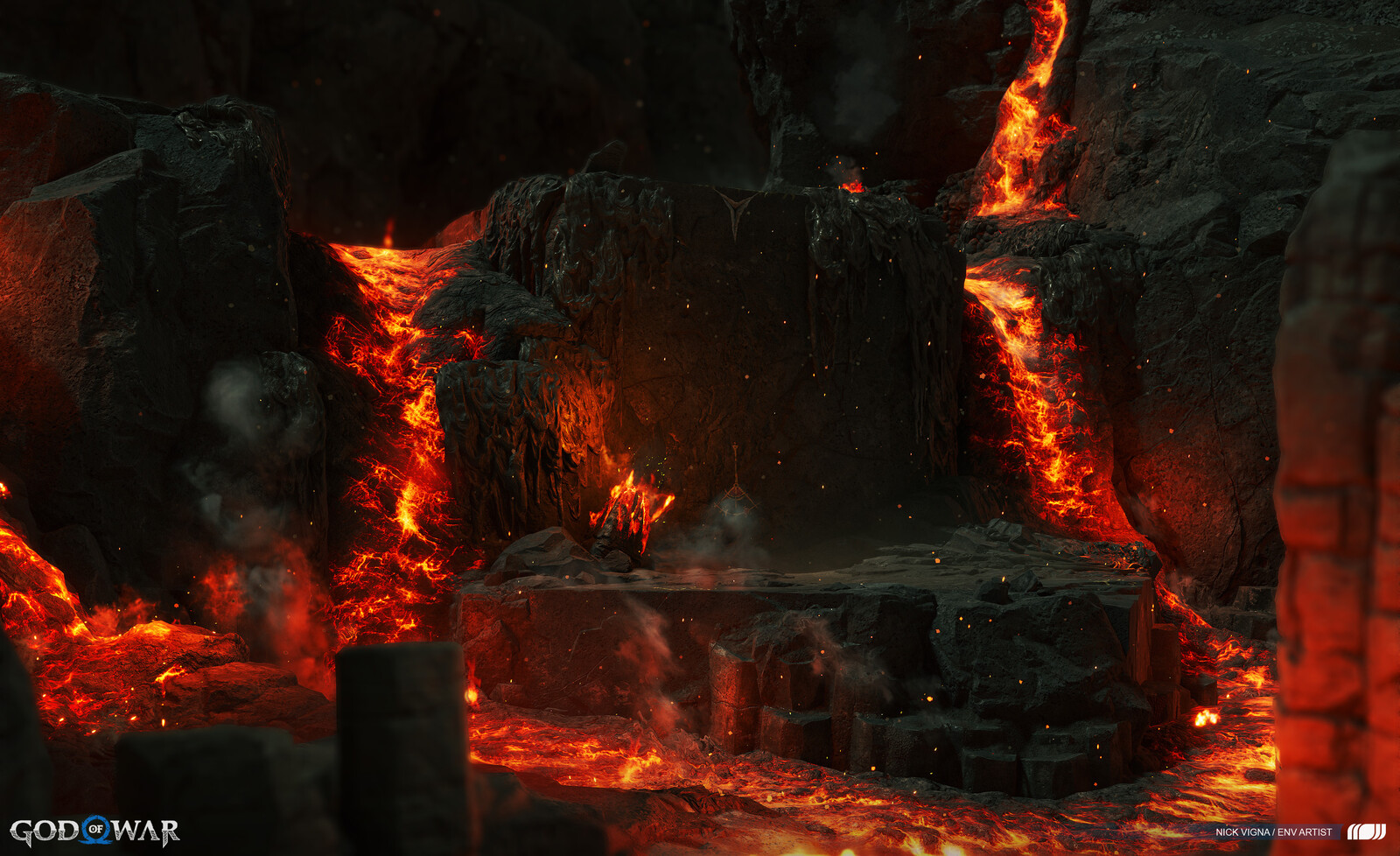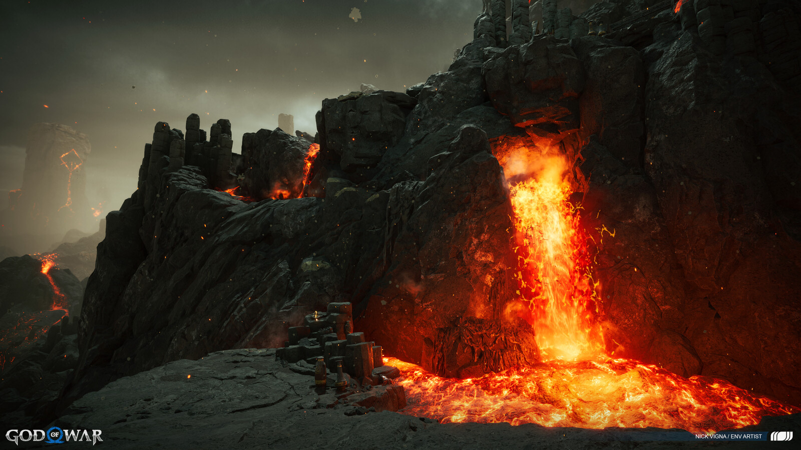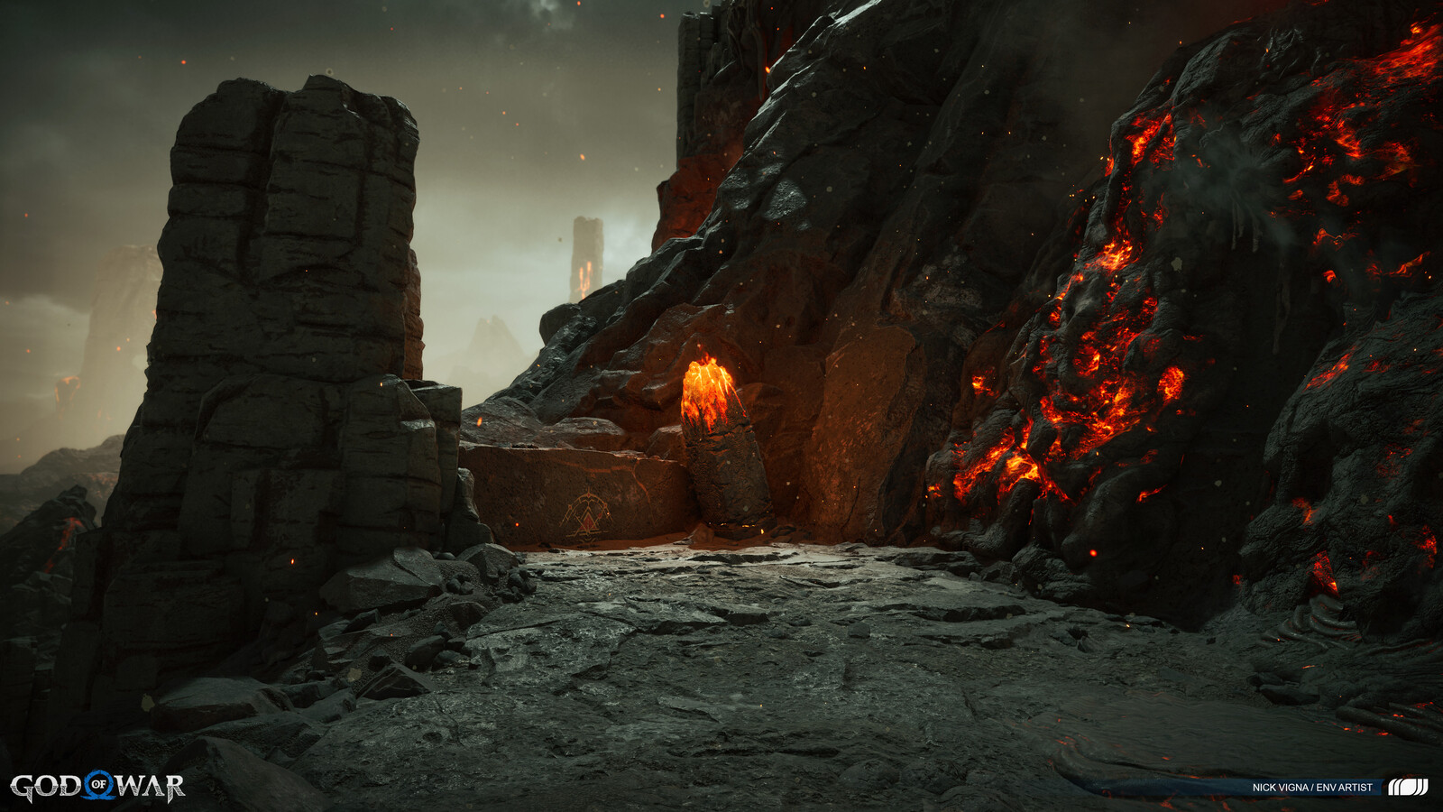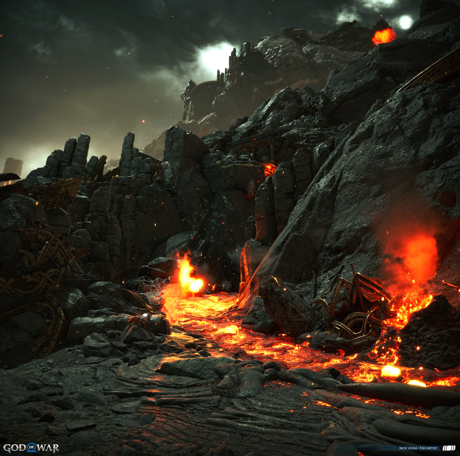 This project was a massive group effort, with many people involved in every area's creation. A special thanks to our lead on this project, John Palamarchuk, who's guidance was unparalleled. A big shout out to Corbett Sachter and Aenok Oh for their Muspelheim work in the previous game. Thank you to SMS and VKE for the opportunity to work on this title! Other notable folks I'd like to call out for this area include: