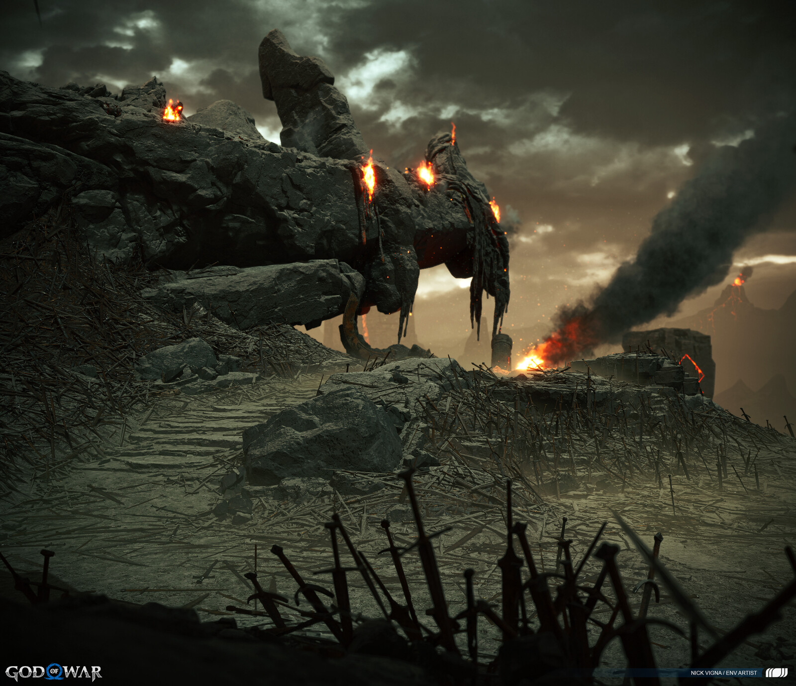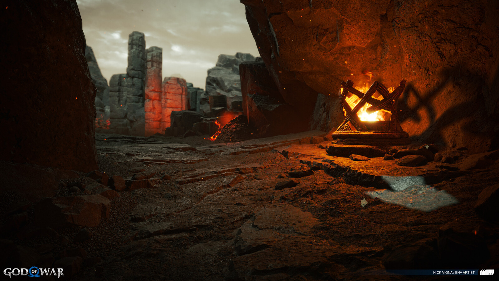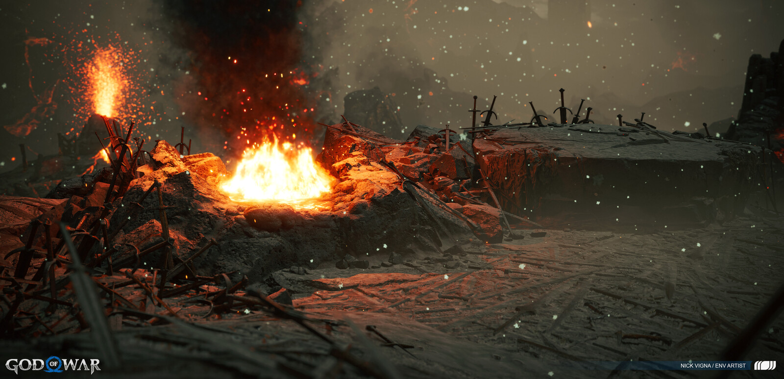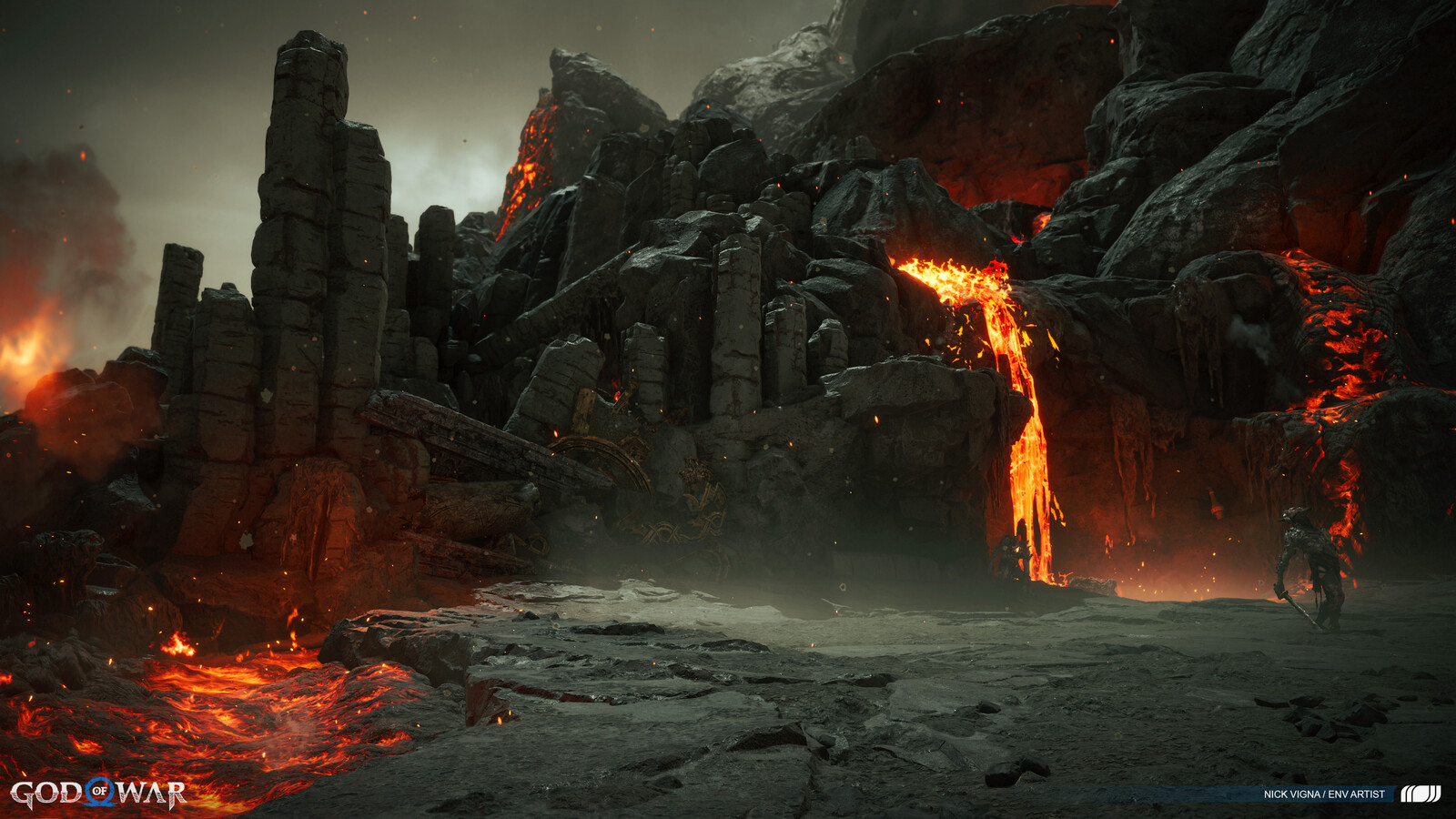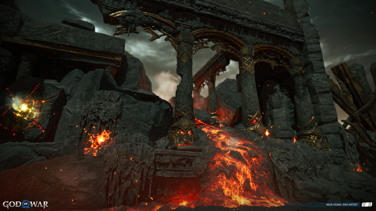 This project was a massive group effort, with many people involved in every area's creation. A special thanks to our lead on this project, John Palamarchuk, who's guidance was unparalleled. A big shout out to Corbett Sachter and Aenok Oh for their Muspelheim work in the previous game. Thank you to SMS and VKE for the opportunity to work on this title! Other notable folks I'd like to call out for this area include: