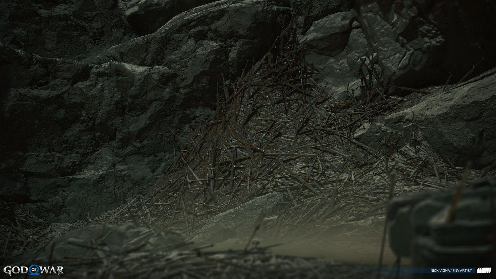 Muspelheim was a blast to work on! In this area, I brought several sections from greybox block out to final polish, which included material work, modelling, world building/set dressing, skirting, and more. Creating Surtr's Forge was a highlight for me in particular, and figuring out how to scatter literally thousands of ash covered swords was a rewarding puzzle to solve.